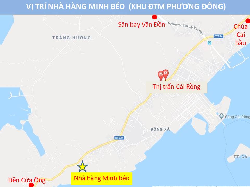 Nằm trong khu đô thị mới Phương Đông huyện Vân Đồn (cách trung tâm thị trấn 2km, gần đền Cửa Ông). Nhà hàng Minh Béo là nhà hàng có khuôn viên thoáng rộng nhất Vân Đồn, rất phù hợp cho các đoàn khách đi ô tô cần nơi đỗ xe thoải mái. Nhà hàng còn được đánh giá có các món ăn, đồ uống ngon với giá cả hợp lý.