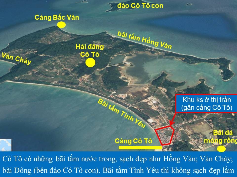 - Các cơ sở lưu trú ở khu vực gần bãi tắm Vàn Chảy: Chiếm khoảng 10% phòng lưu trú trên đảo và cách bãi tắm Vàn Chảy (sóng khá lớn) khoảng 150m đổ lại nên khá thuận tiện cho du khách khi đi ra bãi tắm. Tuy nhiên khu này có giá thuê phòng cao hơn khu trung tâm thị trấn Cô Tô, số lượng nhà hàng, quán Café – giải khát còn khá ít. Ngoài ra đoàn khách phải mất chi phí 1 chiều đi từ khách sạn về cảng Cô Tô (khách sạn đón miễn phí 1 chiều từ cảng về khách sạn)