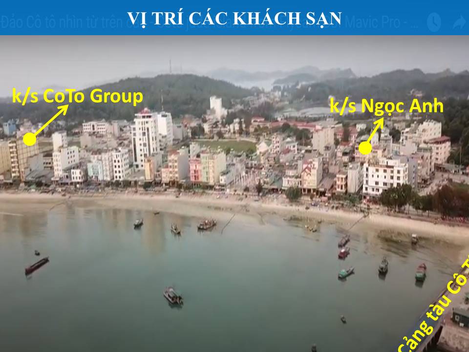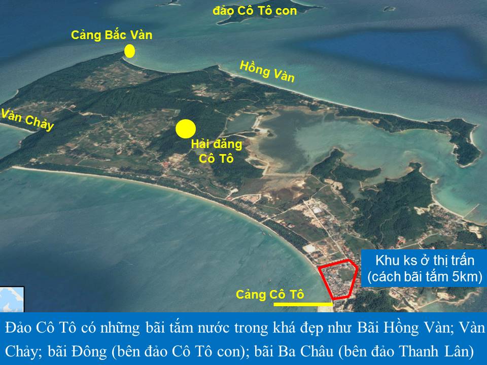 1. Các khách sạn khu vực thị trấn Cô Tô (gần cảng Cô Tô và bãi tắm Tình Yêu): Khách sạn khu vực này chiếm tới gần 70% số lượng khách sạn trên đảo. Khu này được đa phần du khách lựa chọn vì cơ sở vật chất, dịch vụ đầy đủ và giá phòng rẻ hơn các khu khác. Tuy nhiên nếu ở đây thì du khách sẽ tốn chi phí thuê xe điện để đi 5km đến các bãi tắm sạch đẹp nhất trên đảo là Hồng Vàn và Vàn Chảy