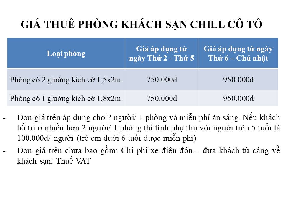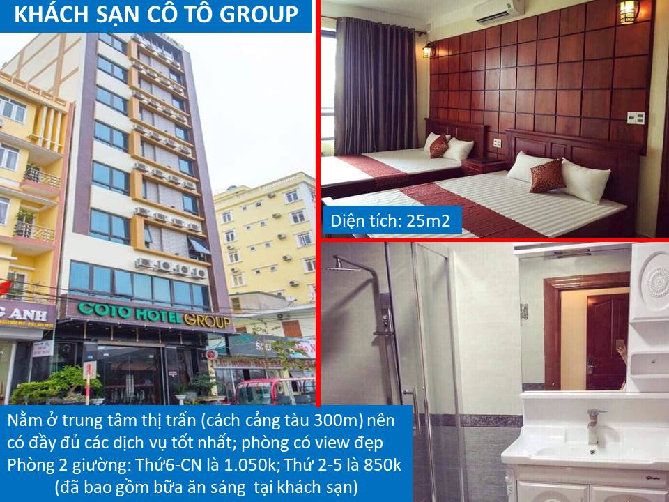 Để đáp ứng nhu cầu du lịch đảo Cô Tô ngày càng tăng của du khách thì hiện nay có khá nhiều các khách sạn đã được xây dựng. Chúng tôi xin đưa ra Thông tin các khách sạn ở đảo Cô Tô để du khách tham khảo, lựa chọn như sau: