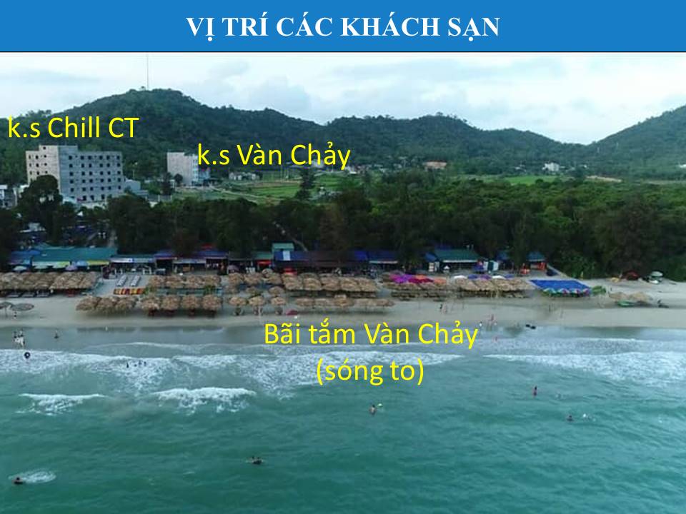 2. Khu khách sạn gần bãi tắm Vàn Chảy: Khu khách sạn này chiếm khoảng 10% số lượng khách sạn trên đảo. Khu này cách bãi tắm Vàn Chảy chỉ từ 50-150m nên rất tiện lợi cho du khách khi ra bãi tắm. Khu này thích hợp cho những đoàn khách thích tắm sóng to và thưởng thức các món ăn BBQ trên bãi tắm. Tuy nhiên giá phòng ở khu vực này cao hơn khu thị trấn khoảng 10-15% và ít dịch vụ vui chơi hơn khu thị trấn.