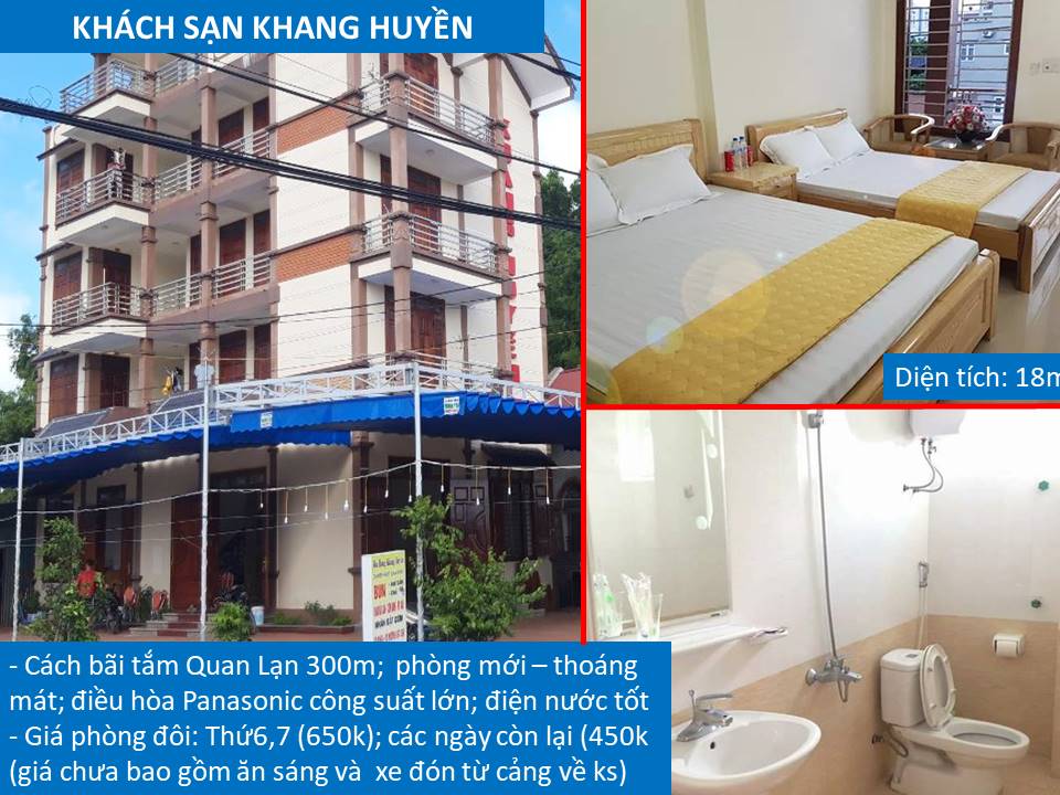 Cùng với sự phát triển du lịch của đảo Quan Lạn - Minh Châu thì ở đây cũng có nhiều khách sạn được xây dựng để phục vụ du khách. Một trong số các khách sạn mới được xây dựng là khách sạn Khang Huyền. Chúng tôi xin đưa ra Thông tin đánh giá về khách sạn Khang Huyền đảo Quan Lạn - Minh Châu để du khách tham khảo như sau: